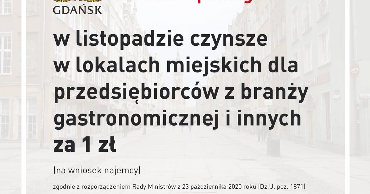 Plansza opisująca na jaką pomoc mogą liczyć przedsiębiorcy. Na górze, z lewej strony herb Gdańska, obok którego napis #Gdańsk pomaga. Poniżej informacja, że w listopadzie czynsze w lokalach miejskich dla przedsiębiorców z branży gastronomicznej i innych za 1 zł. Wszystko umieszczone jest na białym tle, pod którym prześwitują gdańskie kamieniczki.