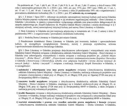 Podczas XVI sesji, radni miasta Gdańska przegłosowali uchwałę dotyczącą powołania nowej, samorządowej instytucji kultury – Domu Literatury. Instytucja, która zostanie wyodrębniona ze struktury Gdańskiej Galerii Miejskiej, rozpocznie działalność 1 lipca 2025 roku. Jej celem będzie rozwijanie i wzmacnianie życia literackiego Gdańska oraz budowa silnego ośrodka literatury w mieście o bogatym i różnorodnym dziedzictwie literackim.