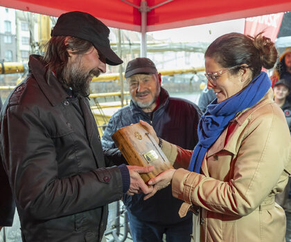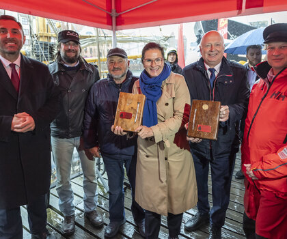 Podczas oficjalnej uroczystości kapitanowie żaglowca – Adam Walczukiewicz i Marcin Dobrowolski – przekazali symboliczne cegiełki wykonane z historycznych fragmentów poszycia jednostki. Trafiły one do Prezydent Gdańska Aleksandry Dulkiewicz oraz przedstawiciela Urzędu Marszałkowskiego Krzysztofa Czopka jako wyraz wdzięczności i pamięci.