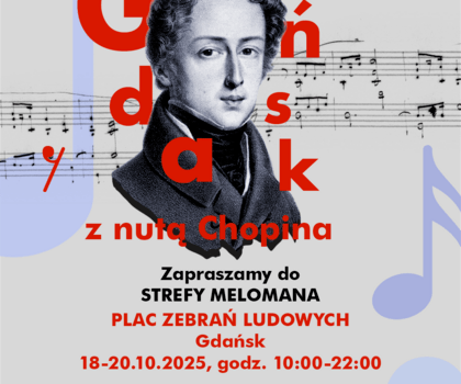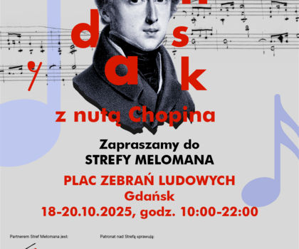Od 18 do 20 października Gdańsk dołączy do muzycznego święta – w sercu miasta, na Placu Zebrań Ludowych, powstanie wyjątkowa Strefa Melomana, inspirowana trwającym XIX Międzynarodowym Konkursem Pianistycznym im. Fryderyka Chopina. Gdańszczanie i goście będą mogli poczuć tam magię muzyki, uczestniczyć w koncertach na żywo, spotkaniach z artystami i twórcami internetowymi, a także wspólnie przeżywać emocje towarzyszące transmisjom finałowych przesłuchań pianistów z warszawskiej sceny Konkursu Chopinowskiego. Wstęp jest wolny.