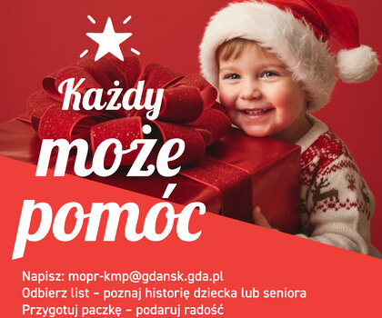 Miejski Ośrodek Pomocy Rodzinie w Gdańsku zachęca mieszkanki i mieszkańców do udziału w świątecznej akcji pt. „Każdy może pomóc”. Zostań Świętym Mikołajem przygotowując prezent dla dziecka lub samotnego seniora, objętych wsparciem. Spełnij ich marzenia. Spraw, aby ten czas był dla nich wyjątkowy i bardzo radosny.