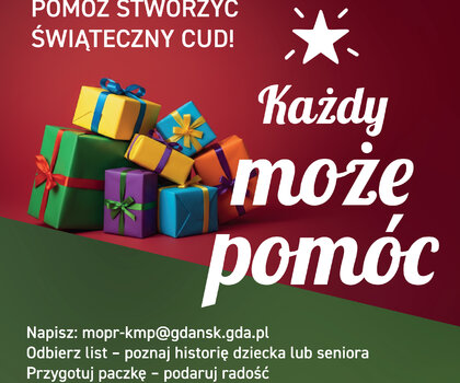 Pierwsza edycja projektu - akcji „Każdy może pomóc”, gdańskiego MOPR odbyła się w 2012 roku. To wyjątkowe przedsięwzięcie, jest bowiem wielowymiarowe w społecznym aspekcie. Ma charakter pomocowy, ale również, tak po prostu sprawia wielką radość beneficjentom – upominki z okazji zimowych świąt otrzymują dzieci i od 2023 roku również seniorki i seniorzy. Akcja aktywizuje, integruje, włącza ludzi do spontanicznego zaangażowania na rzecz drugiego człowieka. Sprawia radość obdarowanym. Cieszy darczyńców, którzy w kreatywny sposób tworzą upominek i nie muszą sprostać konkretnym oczekiwaniom. Wartość prezentu jest określana bowiem przez osobę pomagającą. Akcja uczy solidarności, pokazuje, że nie tylko instytucja powinna wspierać – choć warto łączyć siły, by pomagać. Każdego z nas stać na gesty dobroci.