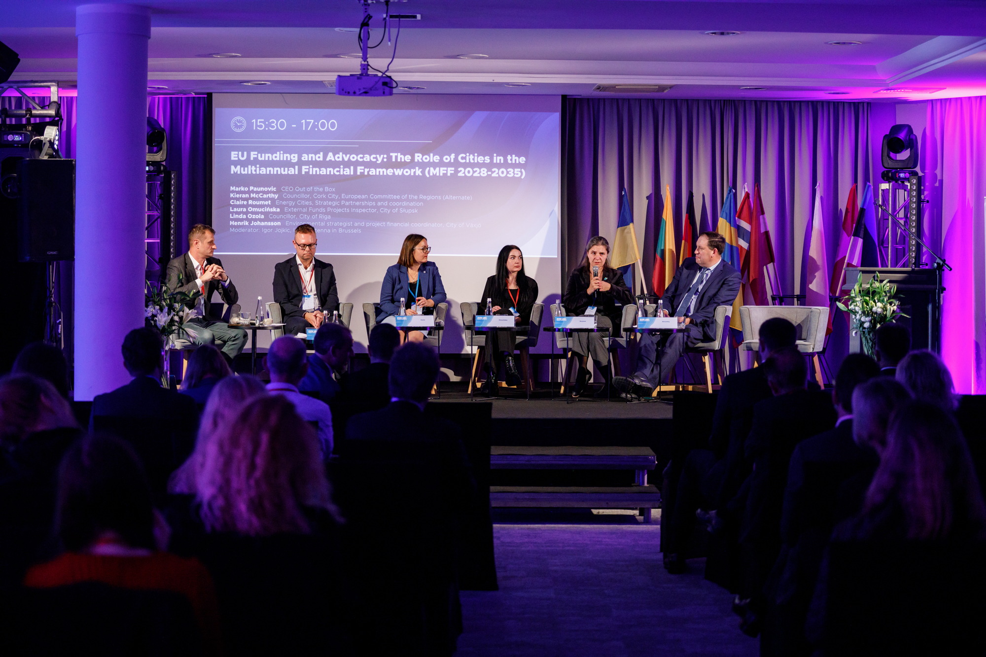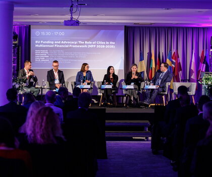 Druga sesja plenarna – „EU Funding and Advocacy: The Role of Cities in the MFF 2028–2034” – skupiła się na praktycznych aspektach udziału miast w procesach unijnych. Wzięli w niej udział m.in. Kieran McCarthy (Komitet Regionów), Claire Roumet (Energy Cities) oraz przedstawiciele miast Rygi, Växjö i Słupska.