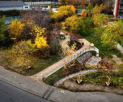 W ramach przedsięwzięcia rozbudowano ogród deszczowy, który wspomaga retencję wody opadowej. Zastosowano rośliny hydrofitowe – odporne na okresowe zalewanie i zdolne do filtrowania zanieczyszczeń z wody. Dzięki temu poprawiono mikroklimat w najbliższym otoczeniu parku.