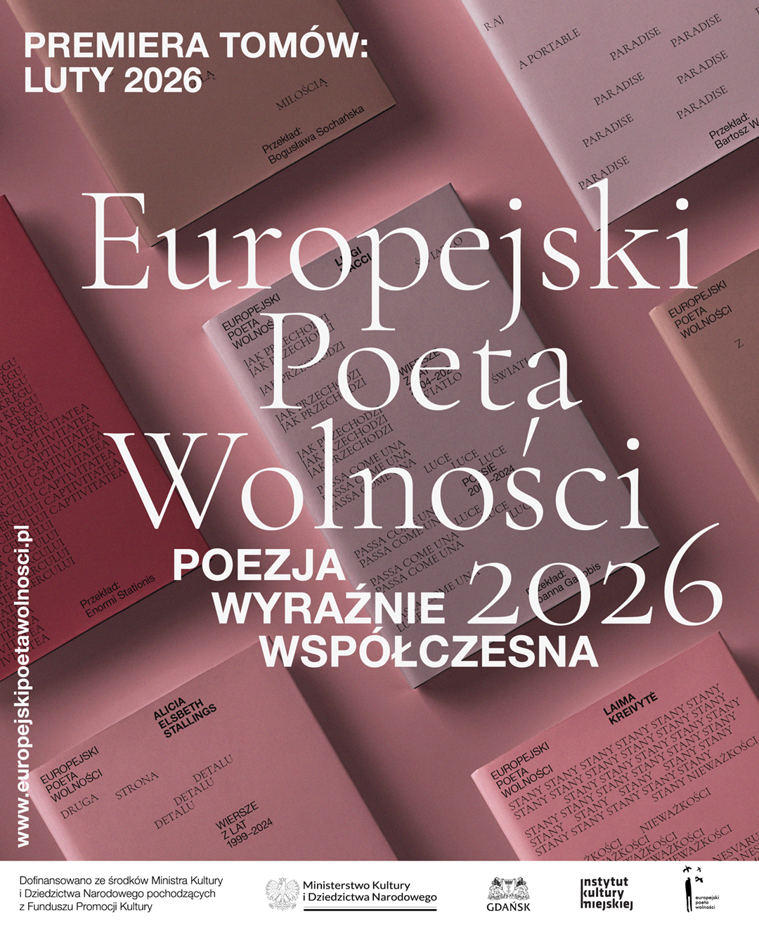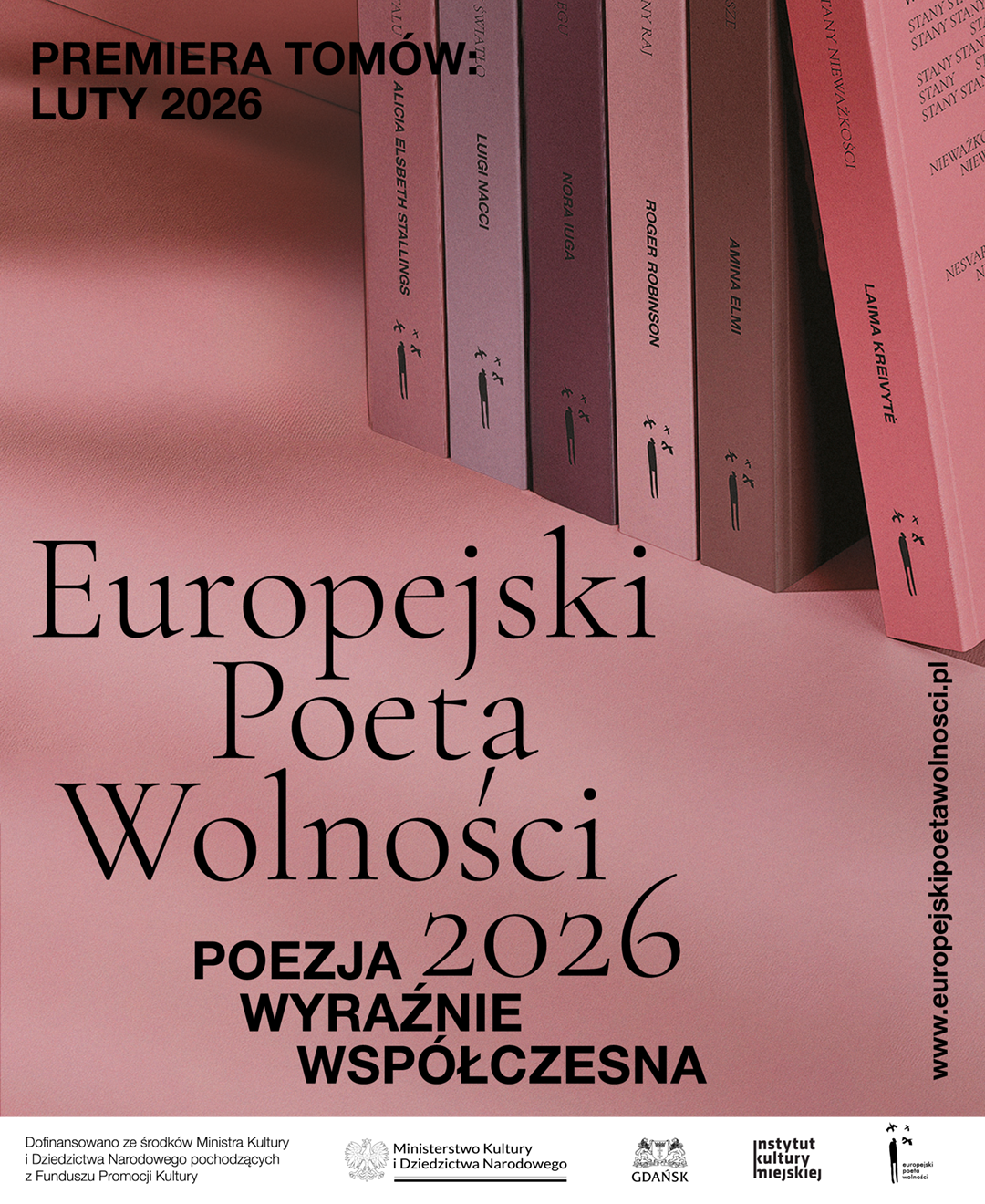 16-18 kwietnia 2026 roku zapraszamy do Gdańska na Festiwal Europejski Poeta Wolności, który odbędzie się pod hasłem „Miejsca styku”. To już dziewiąta edycja wydarzenia organizowanego przez Instytut Kultury Miejskiej. Motyw przewodni wytyczy ścieżki rozmów i spotkań, a zaproponowany został przez Radę Programową festiwalu, którą po raz kolejny tworzą Magdalena Kicińska i Małgorzata Lebda. Wcześniej – pod koniec lutego 2026 roku – ukaże się sześć tomów poetów i poetek nominowanych w tej edycji EPW. Za oprawę wizualną książek odpowiada Maciej Bychowski. Tym samym nasza biblioteka przekładów będzie liczyć już sześćdziesiąt trzy książki. Szczegóły: www.europejskipoetawolnosci.pl.