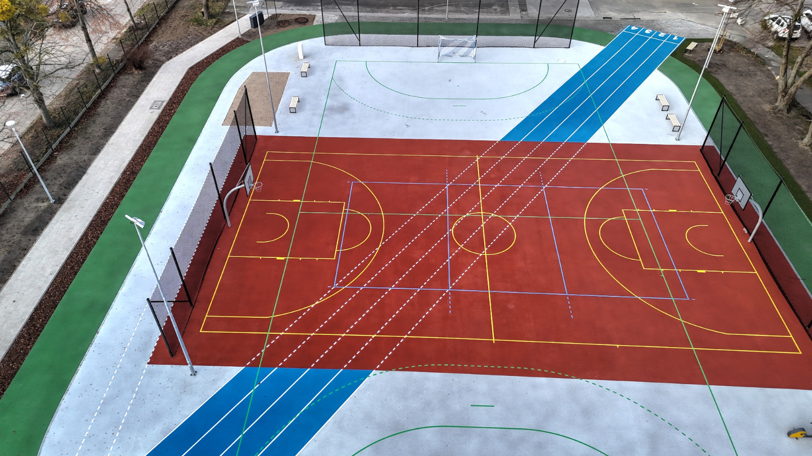 Cały teren został odpowiednio zagospodarowany. Wykonano utwardzenie nawierzchni poliuretanowej, zbudowano chodniki, dokonano nasadzeń drzew i krzewów ozdobnych oraz uzupełniająco wykonano trawniki.