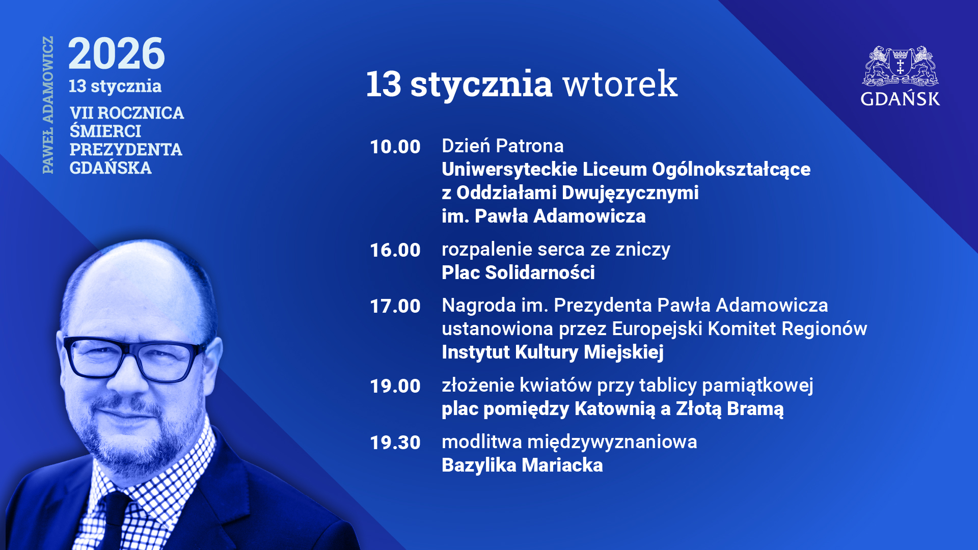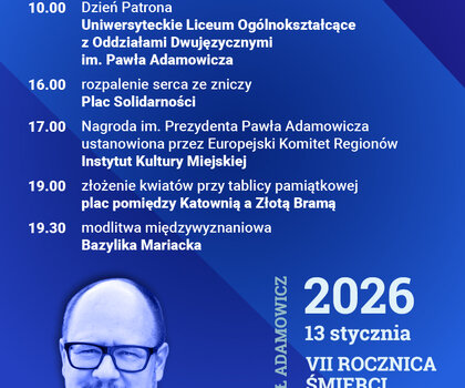 13 stycznia 2026 Gdańsk uczci 7 rocznicę tragicznej śmierci prezydenta Pawła Adamowicza. Zaplanowano m.in. wspólnie złożenie kwiatów przy płycie upamiętniającej wydarzenie z 2019 roku i uczczenie Dnia Patrona razem ze szkolną społecznością Uniwersyteckiego Liceum Ogólnokształcącego. Po raz piąty ogłoszony zostanie także laureat Nagrody im. Pawła Adamowicza.