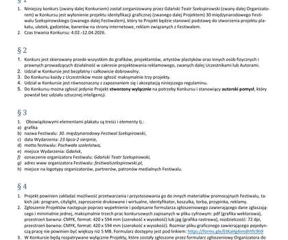 Gdański Teatr Szekspirowski zaprasza do udziału w konkursie na projekt identyfikacji graficznej 30. międzynarodowego Festiwalu Szekspirowskiego. Konkurs skierowany jest do grafików, projektantów, artystów plastyków oraz innych osób fizycznych i prawnych prowadzących działalność w zakresie projektowania reklamowego. Prace przesyłać można do 12 kwietnia 2026 roku.