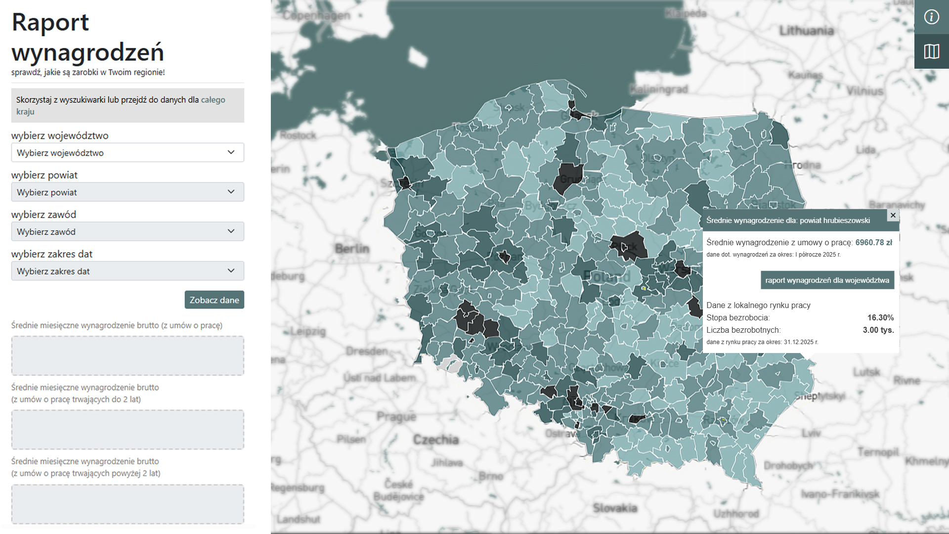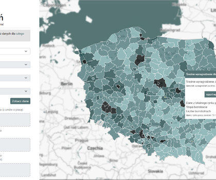 Bardziej szczegółowy widok prezentuje mapa Polski powiatowej. W analogiczny sposób wystarczy aktywować interesujący nas powiat lub miasto, aby otrzymać potrzebne dane. Obok każdej z map znajduje się również wyszukiwarka, za pomocą której można określić województwo, powiat, a następnie wybrać grupę zawodów. To wystarczy, aby zobaczyć statystyki wynagrodzeń w interesującej nas profesji. Skorzystanie z tej ścieżki daje także wgląd w pogłębioną analizę — prezentuje ona nie tylko wynagrodzenie w interesującej nas grupie zawodów, lecz także dostarcza informacji o 10 najlepiej opłacanych profesjach w wybranym powiecie oraz porównuje to wynagrodzenie ze średnią dla całego powiatu, województwa i kraju.