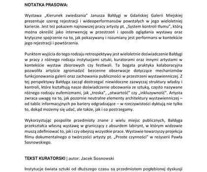 Na ekspozycji pokazane zostaną rejestracje i wideoperformanse z różnych etapów wieloletniej kariery Janusza Bałdygi. Istotnym elementem wystawy jest również najnowsza realizacja artysty pt. „System kontroli tłumu”.