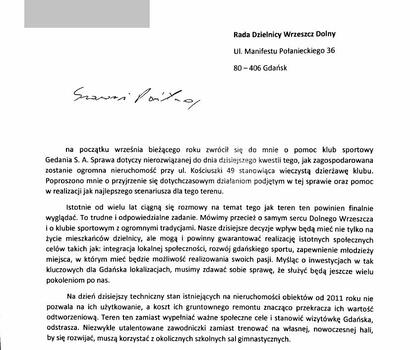 W świetle wystąpienia posła Kacpra Płażyńskiego na lutowej sesji Rady Miasta warto przypomnieć, co 6 października 2016 roku pisał do Rady Dzielnicy Wrzeszcz Dolny (pismo w załączeniu):