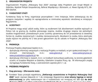 Firmy zainteresowane udziałem w Wakacyjnym Stażu 2026 zapraszamy do wypełnienia i przesłania deklaracji uczestnictwa w Projekcie wraz z logo firmy w wersji elektronicznej do dnia 20 marca 2026 r. na adres: wakacyjny.staz@gdansk.gda.pl z dopiskiem Wakacyjny Staż 2026 – deklaracja uczestnictwa. Fundatorzy staży proszeni są o samodzielne wypełnienie oferty stażu na stronie projektu, w terminie najpóźniej do dnia 27 marca 2026 r. Lista fundatorów staży wraz z ofertami zostanie opublikowana na stronie internetowej Projektu do dnia 31 marca 2026 r.