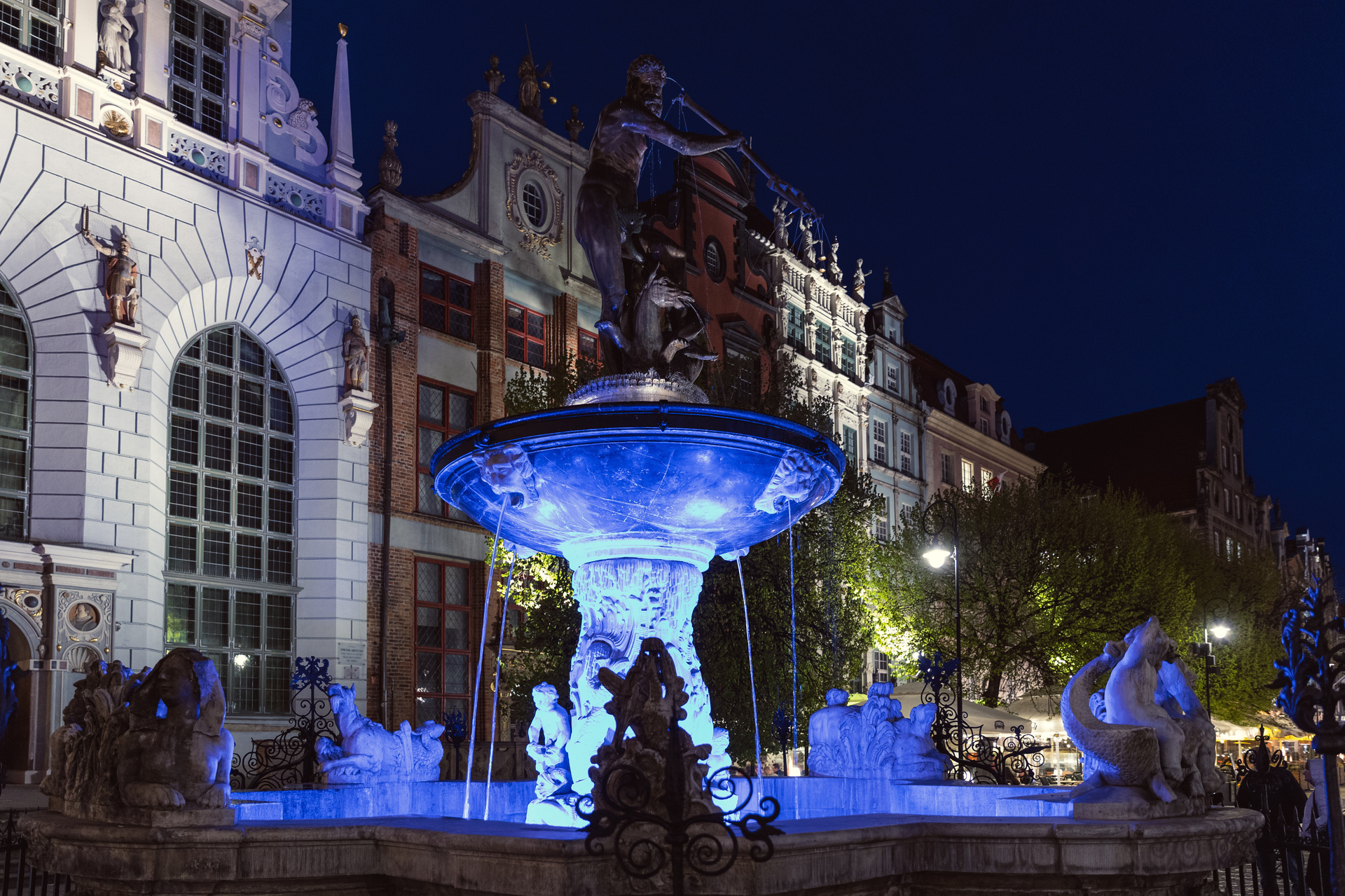Niebieska iluminacja fontanny Neptuna w hołdzie poległym policjantom