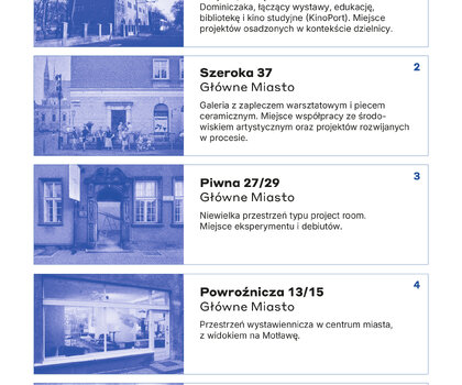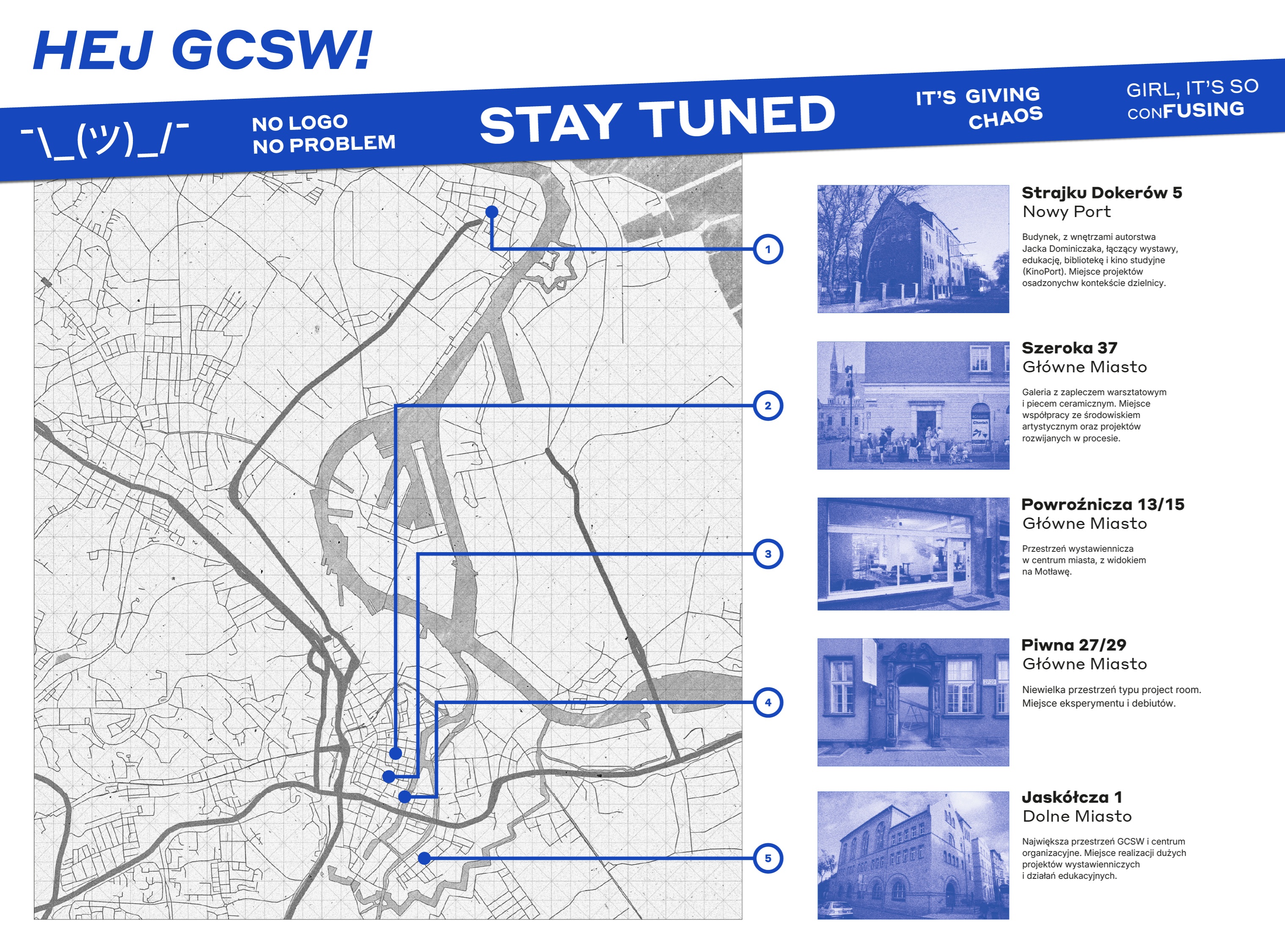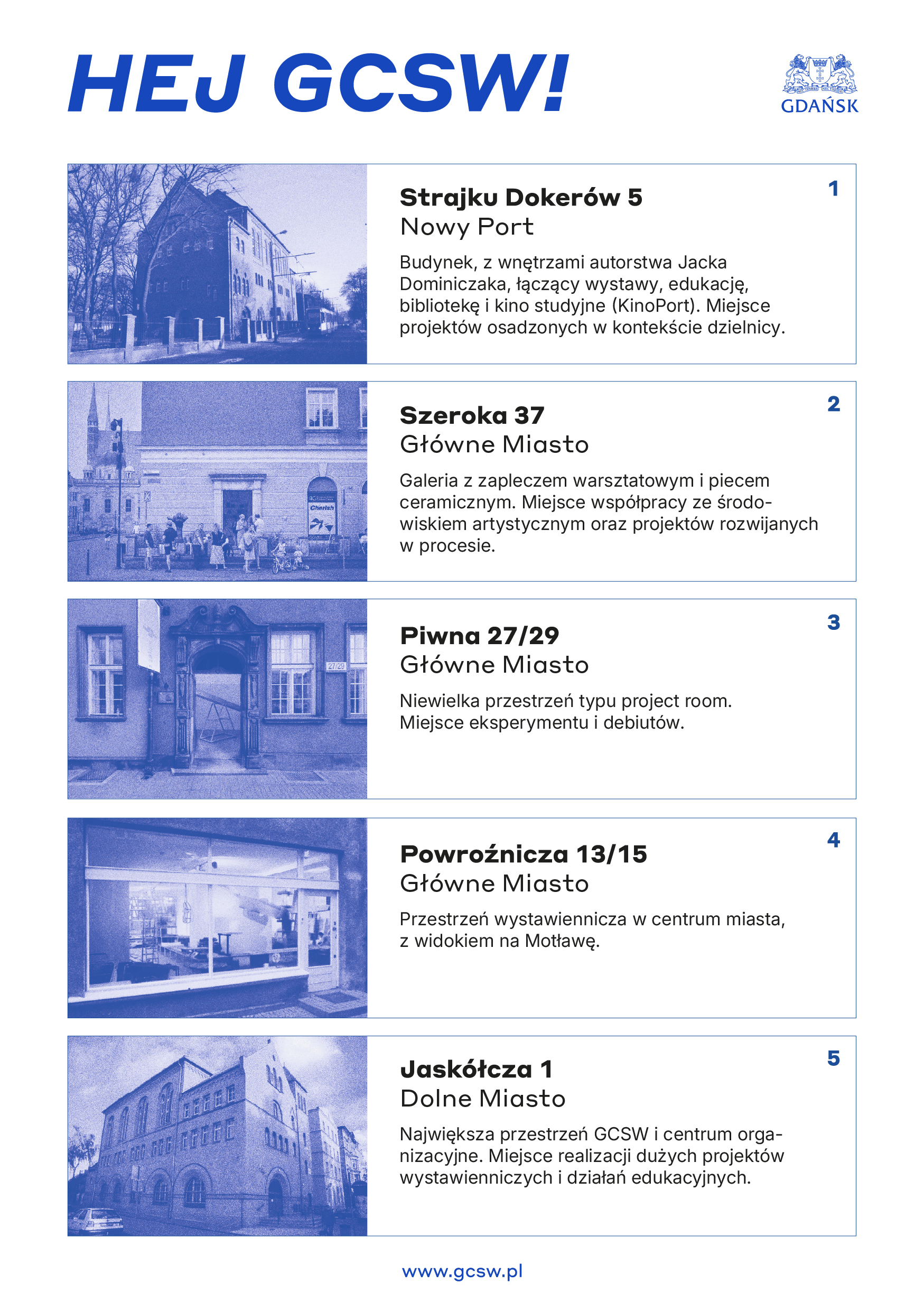 GCSW działa w Gdańsku jednocześnie w pięciu lokalizacjach: na Dolnym Mieście, w Nowym Porcie i w trzech przestrzeniach na Głównym Mieście. Każda ma własny program i własną publiczność. Pięć lokalizacji pozwoli prowadzić różne typy działań jednocześnie i kierować je do różnych grup odbiorców. Model instytucji rozproszonej umożliwi realizację kameralnych projektów osadzonych w konkretnym miejscu, ale też łączenie przestrzeni przy większych realizacjach wystawienniczych.