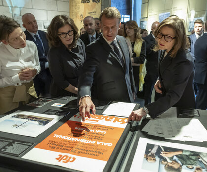 Kolejnym etapem było przejście do Europejskiego Centrum Solidarności, gdzie delegacja zwiedziła wystawę stałą prezentującą historię ruchu Solidarności oraz przemian demokratycznych w Europie Środkowo-Wschodniej. Prezydentowi Macronowi towarzyszyła Aleksandra Dulkiewicz, prezydent Gdańska oraz pełniąca obowiązki dyrektorki ECS Magdalena Mistat.