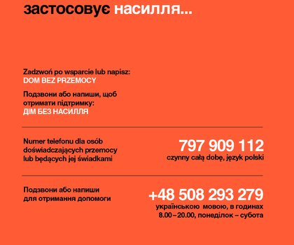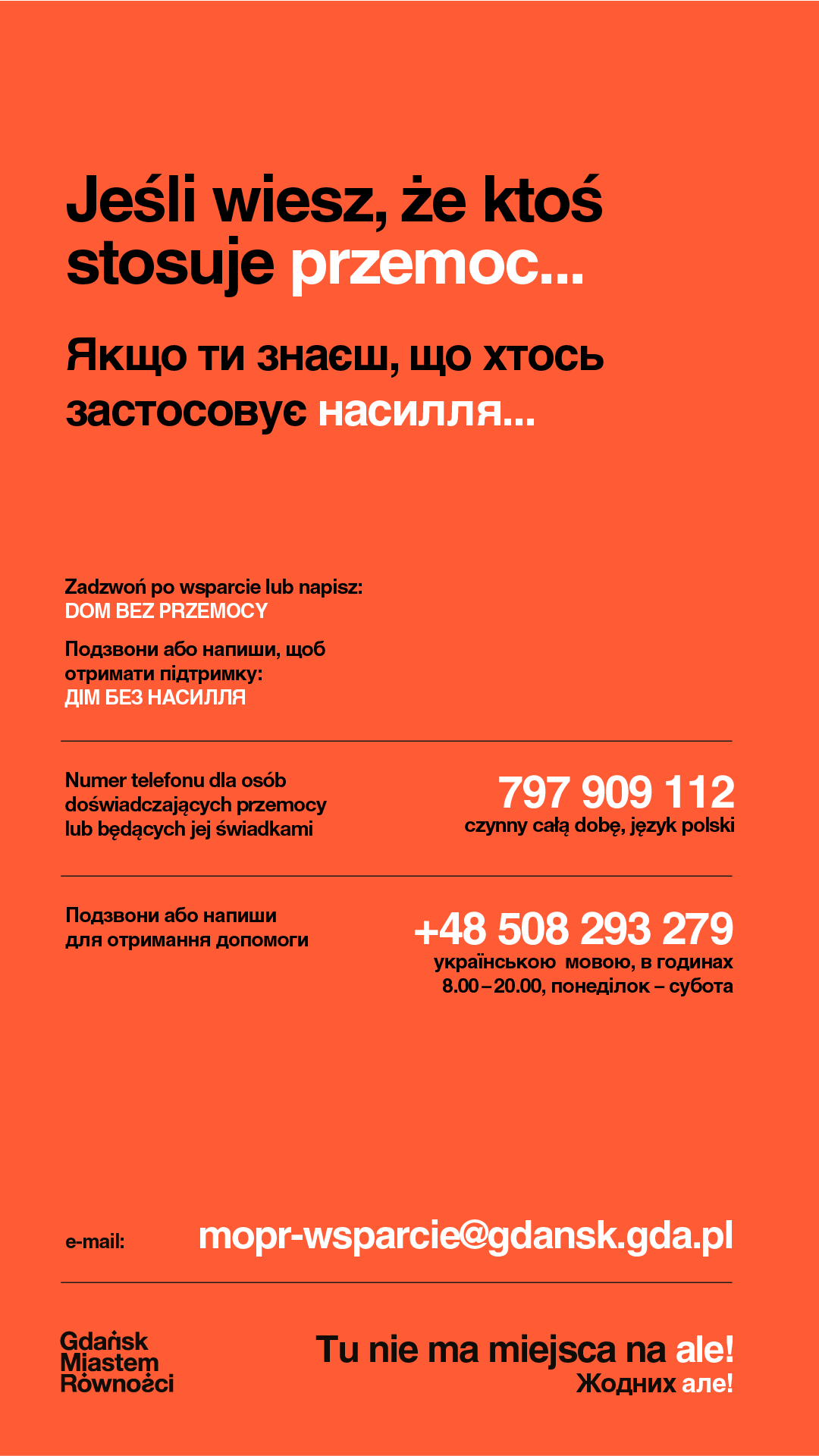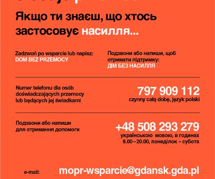 Przemoc domowa może dotknąć każdego bez względu na płeć, wiek, kolor skóry, status ekonomiczny czy przekonania. Przybiera różne formy: od psychicznej, fizycznej po ekonomiczną i seksualną. Zawsze jest niszcząca dla rodziny. By przeciwdziałać problemowi społecznemu i przede wszystkim jak najskuteczniej pomagać osobom doświadczającym agresji od bliskich, Miejski Ośrodek Pomocy Rodzinie w Gdańsku m.in. od kilku lat prowadzi kampanię społeczną pt. „Dom bez przemocy”. Wystarczy zadzwonić pod całodobowy numer tel.: 797 909 112 lub napisać na adres e-mail: mopr-wsparcie@gdansk.gda.pl, by otrzymać adekwatne wsparcie. Te pomocowe kontakty działają w ramach Ośrodka Interwencji Kryzysowej (OIK) MOPR. Sygnały dotyczące przemocy domowej przyjmują od osób jej doznających oraz od świadków takich sytuacji, psycholodzy oraz inni specjaliści OIK. Pomoc w tym zakresie dostępna jest też w języku ukraińskim, pod numerem tel.: +48 508 293 279 (czynny od pn. do sob., w godz.: 8.00 – 20.00).