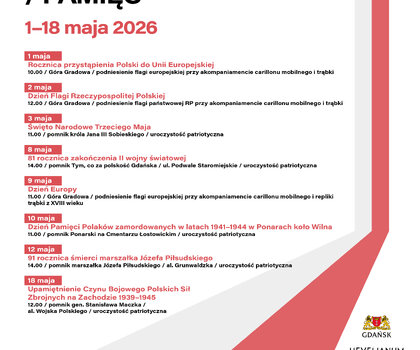 Przed nami wyjątkowe dni pełne symboli, wzruszeń i wspólnego przeżywania historii. W programie nie zabraknie wydarzeń upamiętniających rocznice istotne zarówno dla Polski, jak i dla Europy. Majowe obchody patriotyczne w Gdańsku połączą uroczyste podniesienia flag na najwyższym maszcie w mieście, dźwięki carillonów oraz widowiskowe inscenizacje historyczne. Na mieszkanki, mieszkańców oraz turystów czeka niemal 3 tysiące biało‑czerwonych, gdańskich i europejskich flag, które będzie można odebrać i zabrać ze sobą, by aktywnie włączyć się we wspólne świętowanie.