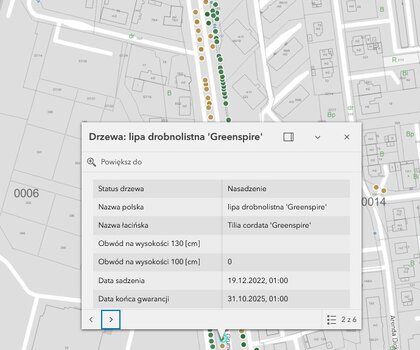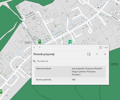 Kluczowym elementem mapy są zinwentaryzowane drzewa. Każdy taki egzemplarz widnieje na mapie jako osobny punkt. Wystarczy jedno kliknięcie, aby wyświetliła się jego szczegółowa metryczka. Dowiemy się z niej m.in.: