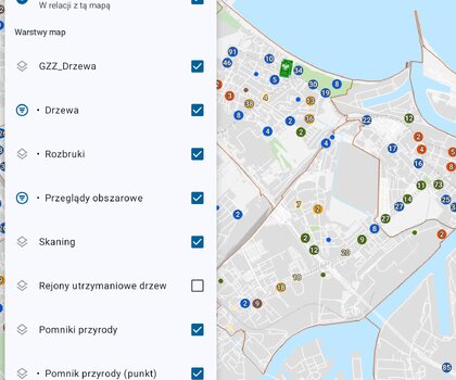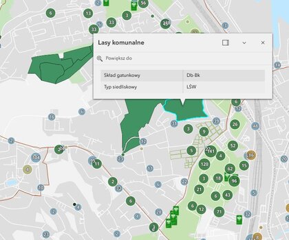 Dla pełnej przejrzystości, warstwę „Gdańska Zieleń” wyposażono w podwarstwy tematyczne. Można na nich sprawdzić lokalizację pomników przyrody, zieleń na cmentarzach komunalnych oraz tereny gdańskich lasów komunalnych. W przypadku tych ostatnich mapa podpowie nam, jaki jest skład gatunkowy danego lasu (np. przewaga dębu) oraz jego typ siedliskowy (np. bór suchy).