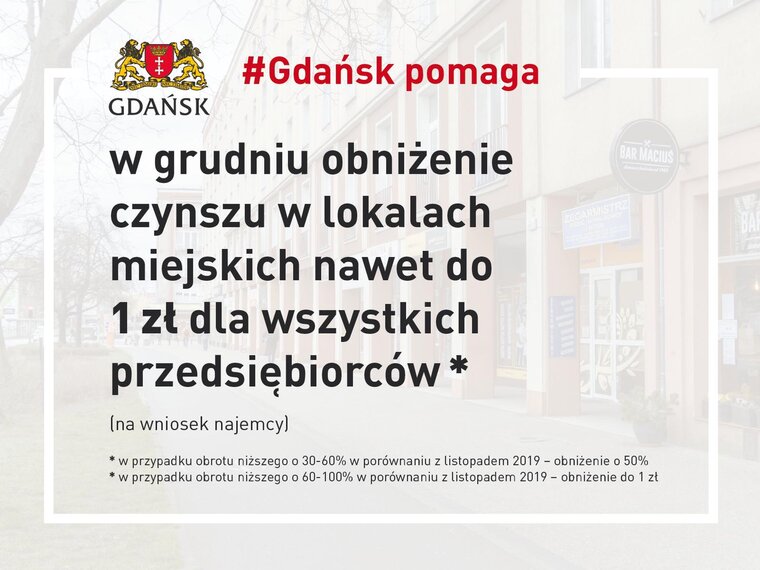 Plansza opisująca na jaką pomoc mogą liczyć przedsiębiorcy. Na górze, z lewej strony herb Gdańska, obok którego napis #Gdańsk pomaga. Poniżej informacja, że w grudniu obniżenie czynszu w lokalach miejskich dla wszystkich przedsiębiorców nawet do 1 zł. Wszystko umieszczone jest na białym tle, pod którym prześwitują gdańskie kamieniczki.
