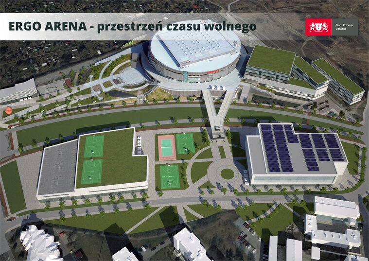 Wizualizacja zagospodarowania terenu wokół ERGO ARENY. Na planszy widać korty tenisowe, boiska, budynki usługowe. Widok w dzień