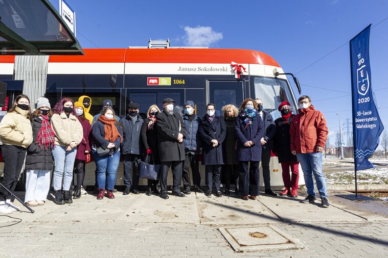 Uczestnicy uroczystości nadania imienia Janusza Sokołowskiego gdańskiemu tramwajowi. W tle tramwaj im. Janusza Sokołowskiego.