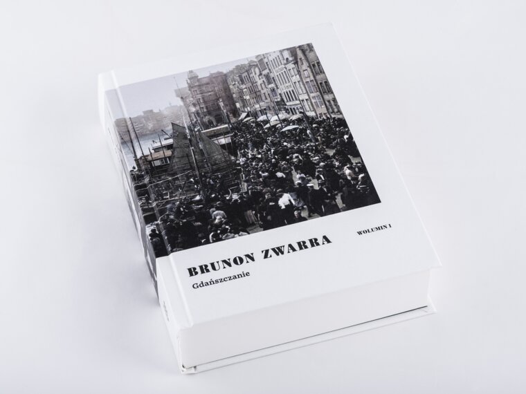 Zdjęcie. Pierwszy z dwóch wolumenów powieści Gdańszczanie Brunona Zwarry. Na okładce koloryzowana przedwojenna fotografia fragmentu Długiego Pobrzeża oraz ludzi.