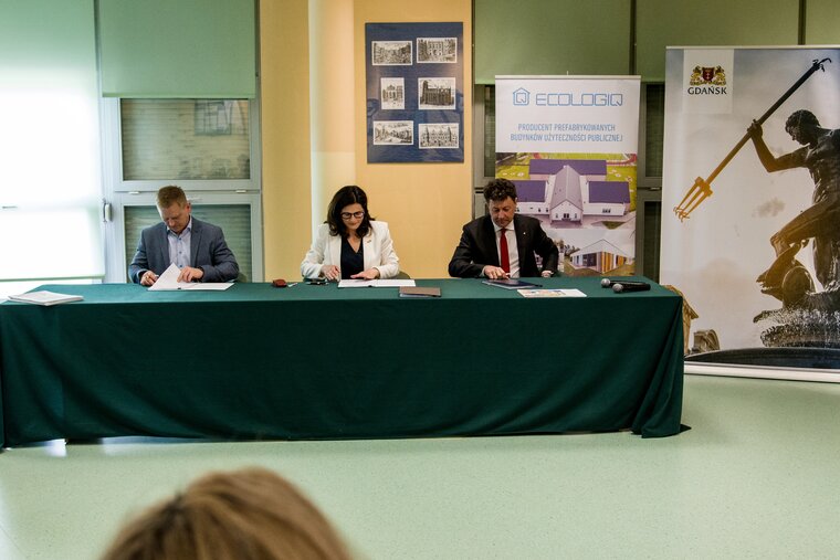 Umowę na rozbudowę ZSO nr 2 podpisali od lewej: Karol Kalinowski, dyrektor DRMG, Aleksandra Dulkiewicz, prezydent Gdańska oraz Tomasz Balcerowski, prezes zarządu Ekoinbud