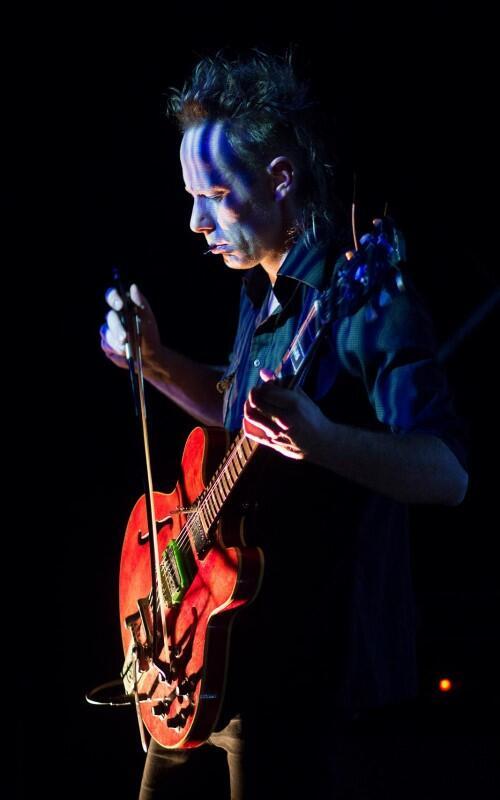 Zdjęcie artysty grającego smyczkiem na elektrycznej gitarze.