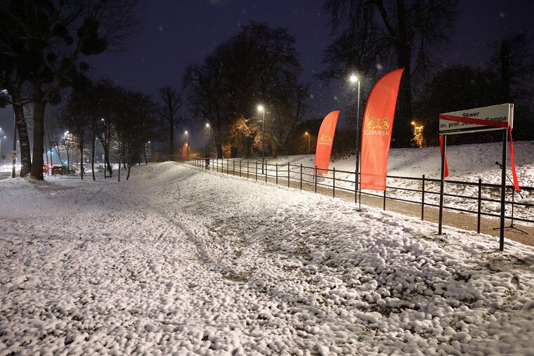 Ośnieżony skwer przy przystanku autobusowym Gościnna.
