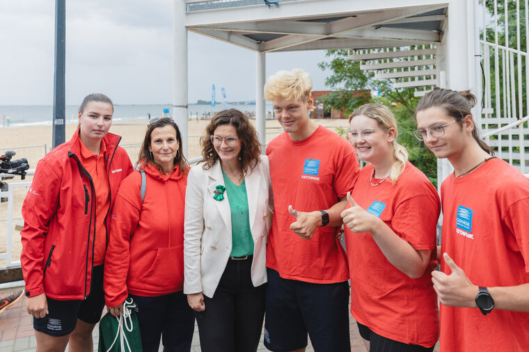 Sześć osób stojących na tle plaży. Trzy osoby po lewej stronie mają czerwone kurtki, a trzy po prawej czerwone koszulki z napisem „GDAŃSKI RATOWNIK”. W centrum stoi osoba w białej marynarce i zielonej bluzce.