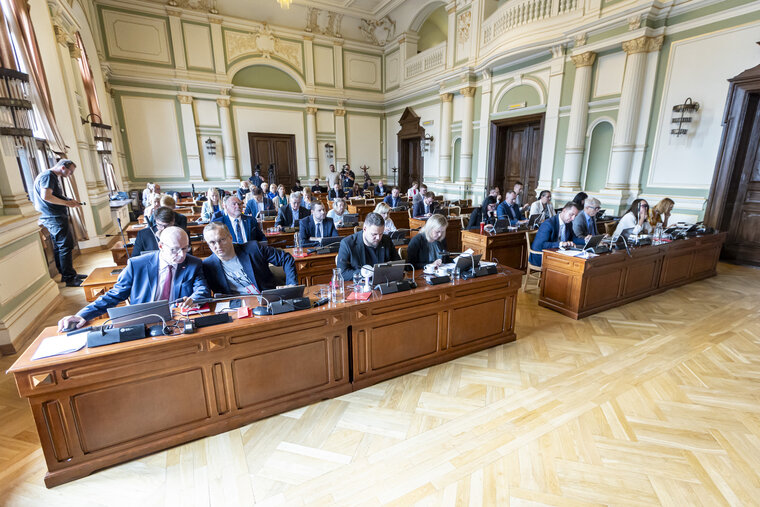 W eleganckiej sali z wysokimi sufitami i ozdobnymi detalami architektonicznymi kilkadziesiąt osób pracuje przy drewnianych stołach, korzystając z laptopów i dokumentów. Przestrzeń rozświetlają duże okna, przez które wpada naturalne światło. W tle widoczne są osoby stojące lub przechodzące między stołami.