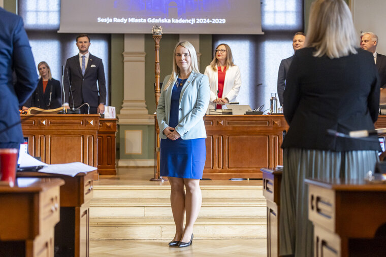 W sali obrad stoi kobieta ubrana w niebieską sukienkę i jasną marynarkę, zwrócona twarzą w stronę uczestników. W tle widoczni są ludzie siedzący przy drewnianych stołach oraz ekran z napisem informującym o sesji Rady Miasta Gdańska kadencji 2024–2029. Atmosfera miejsca jest formalna i urzędowa.