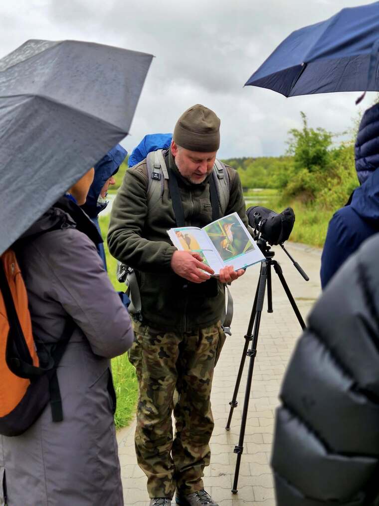 Mężczyzna ubrany w kurtkę i spodnie moro trzyma otwartą książkę z ilustracjami ptaków, pokazując ją kilku osobom stojącym obok. Obok stoi teleskop ustawiony na statywie, używany do obserwacji przyrodniczych. Wszyscy uczestnicy mają na sobie ciepłe ubrania i trzymają parasole, co sugeruje chłodną i deszczową pogodę.