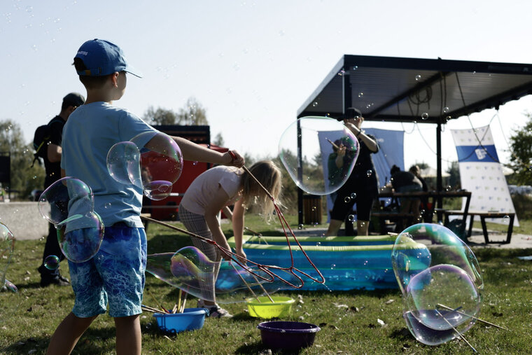 Dzieci tworzą duże bańki mydlane, korzystając z kolorowych wiaderek i obręczy na zielonej trawie. W tle znajduje się namiot oraz kilka osób zajętych różnymi aktywnościami na świeżym powietrzu.