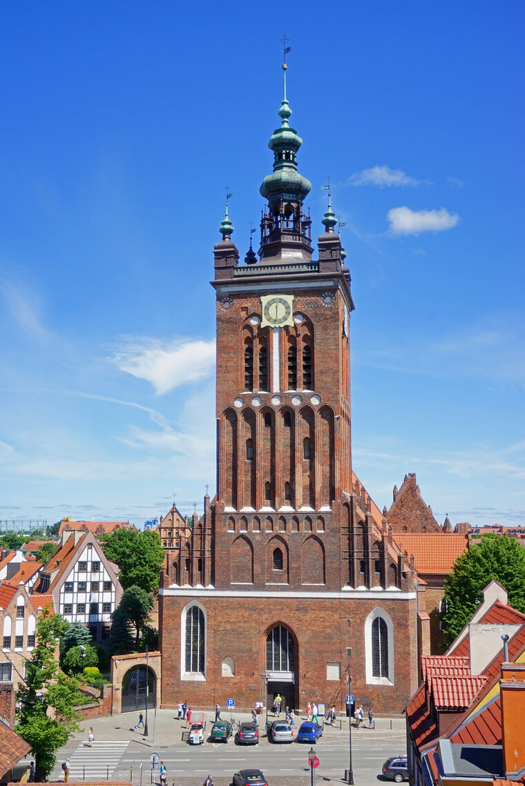Widok z oddali na kościół św. Katarzyny, w którym mieści się Muzeum Nauki Gdańskiej. Widok fasady budynku. Na wieży kościoła umieszczony okrągły zegar, wieża zwieńczona balustradą i wieżyczkami.