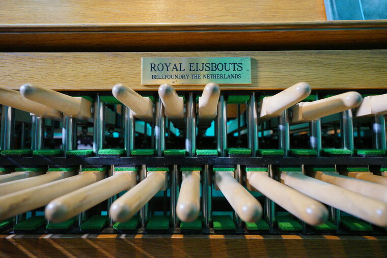 Klawiatura carillonu. Dwa rzędy drewniane pałek pełniących funkcję klawiszy. Nad nimi tabliczka znamionowa holenderskiej firmy Royal Eisbouts - producenta instrumentu.