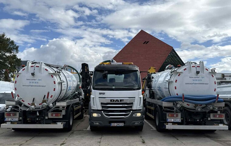 Trzy ciężarówki zaparkowane są obok siebie, w tym dwie cysterny asenizacyjne i jedna ciężarówka marki DAF. W tle znajduje się budynek z trójkątnym dachem oraz niebo z widocznymi chmurami. Na cysternach umieszczono napisy informacyjne i dane kontaktowe firmy zajmującej się wywozem nieczystości.