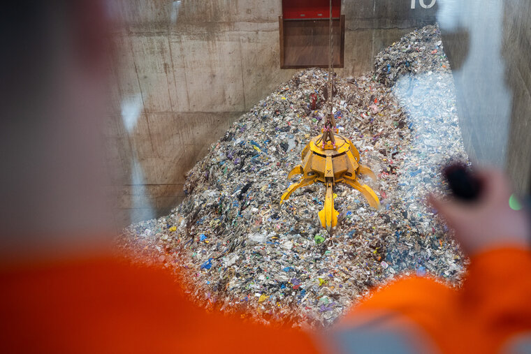 Wnętrze surowego, betonowego pomieszczenia wypełnia ogromna sterta odpadów, nad którą zawieszony jest żółty chwytak dźwigu. W dolnej części kadru rozmycie sugeruje obecność osoby w pomarańczowym stroju roboczym, prawdopodobnie obsługującej maszynę.