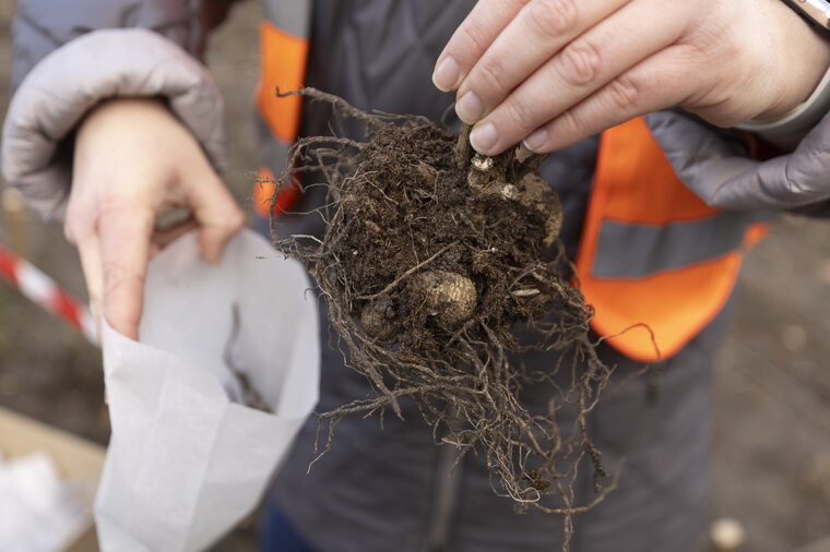 zbliżenie na dłonie osoby trzymającej kępę korzeni z ziemią i cebulkami roślin. W drugiej ręce znajduje się biały papierowy worek, prawdopodobnie na sadzonki. W tle widoczny jest fragment odzieży roboczej w kolorze pomarańczowym oraz ziemia przygotowana do nasadzeń.