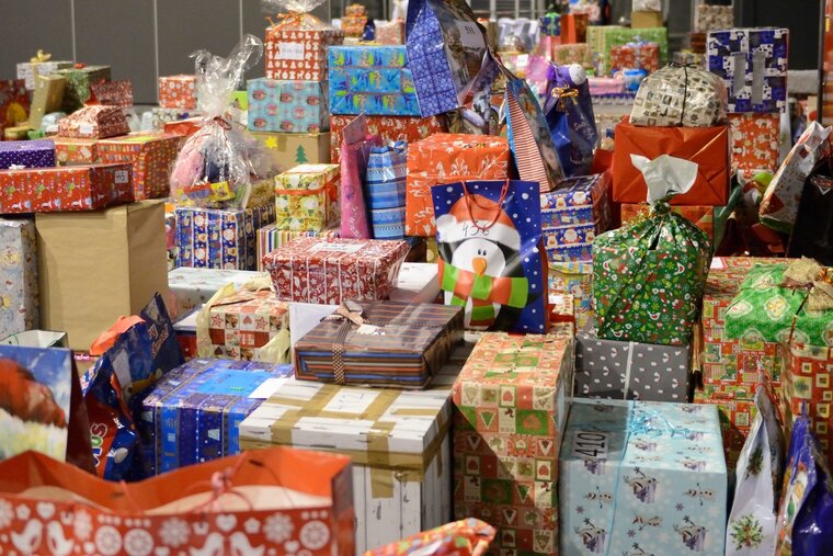 Finał jednej z edycji " Każdy może pomóc" - na zdjęciu mnóstwo świątecznie zapakowanych prezentów dla dzieci (prezenty ułożone na podłodze)