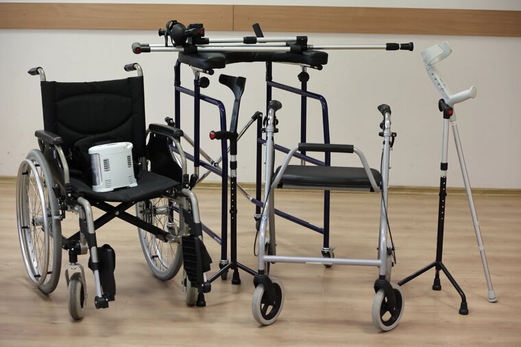 Wyposażenie wypożyczalni sprzętu rehabilitacyjnego: wózek inwalidzki, chodzik, laska trójnożna