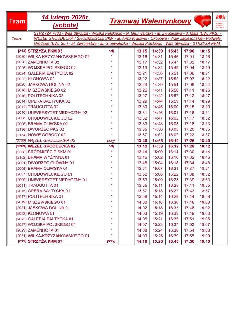 Walentynkowy tramwaj, rozkład jazdy 14 lutego