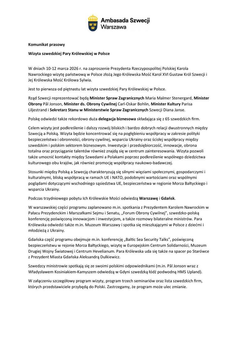 Komunikat prasowy Ambasady Szwecji