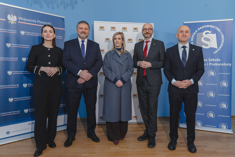 Od lewej stoją: Beata Rutkiewicz, wojewoda pomorska, Waldemar Żurek, minister sprawiedliwości i prokurator generalny, Emilia Lodzińska, zastępczyni prezydent Gdańska ds. rozwoju przestrzennego i mieszkalnictwa, prof. Piotr Girdwoyń, dyrektor Krajowej Szkoły Sądownictwa i Prokuratury, Dariusz Mazur, podsekretarz stanu w Ministerstwie Sprawiedliwości
